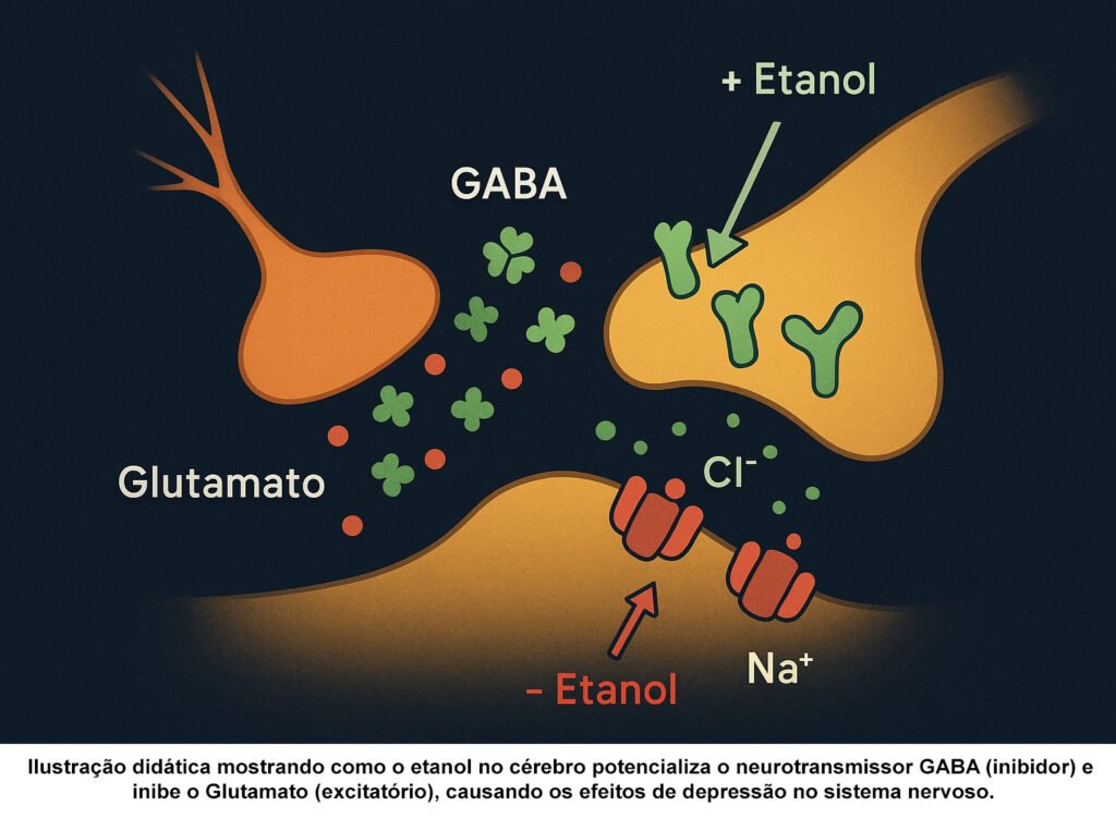 O etanol é um depressor do sistema nervoso. Ele interfere na comunicação entre os neurônios de duas formas principais: