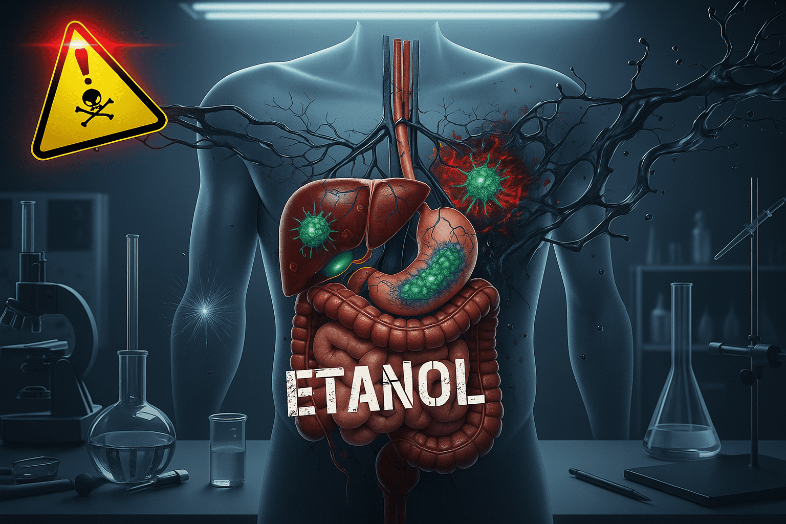 O acetaldeído, metabólito tóxico do etanol, é classificado como carcinógeno do Grupo 1 pela Agência Internacional de Pesquisa em Câncer (IARC). O consumo de álcool está diretamente ligado a um maior risco de câncer de boca, faringe, laringe, esôfago, fígado, cólon e mama.