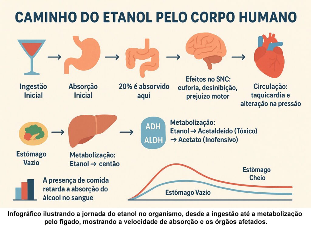 • Fatores que Influenciam: A presença de comida no estômago (especialmente gordura e proteína) retarda significativamente a absorção. Por isso, beber de estômago vazio leva a uma embriaguez mais rápida e intensa.