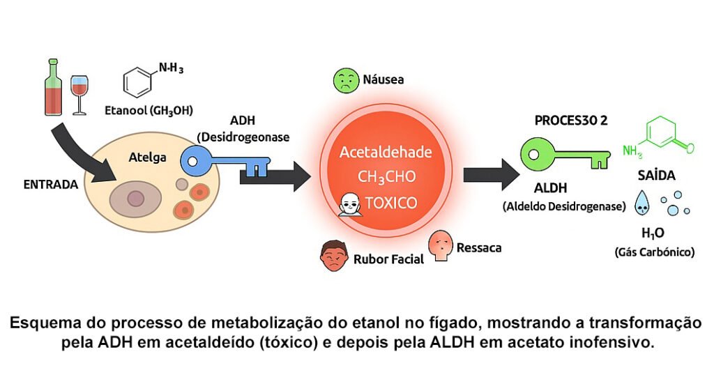 • Passo 1 (ADH): A enzima Álcool Desidrogenase (ADH) converte o etanol em acetaldeído. Este composto é extremamente tóxico e carcinogênico, sendo o grande vilão dos danos celulares e dos sintomas de ressaca (náusea, taquicardia, rubor facial).