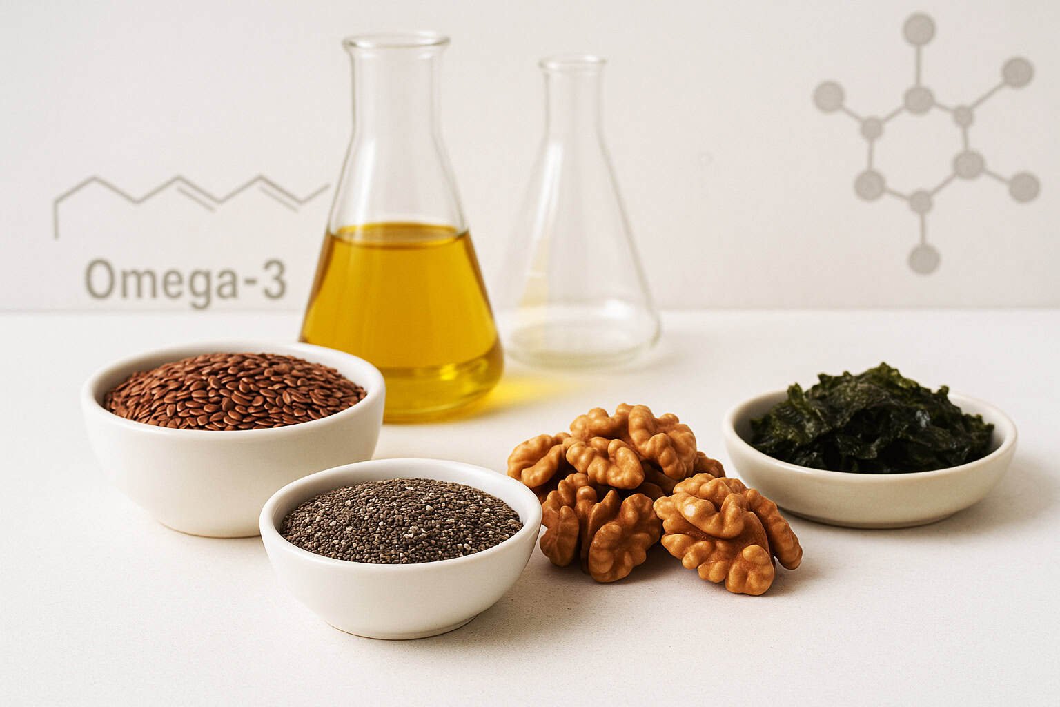 Veganos podem obter ômega-3 através de sementes, nozes e algas. Para garantir DHA/EPA, suplementos de algas são a melhor opção.
