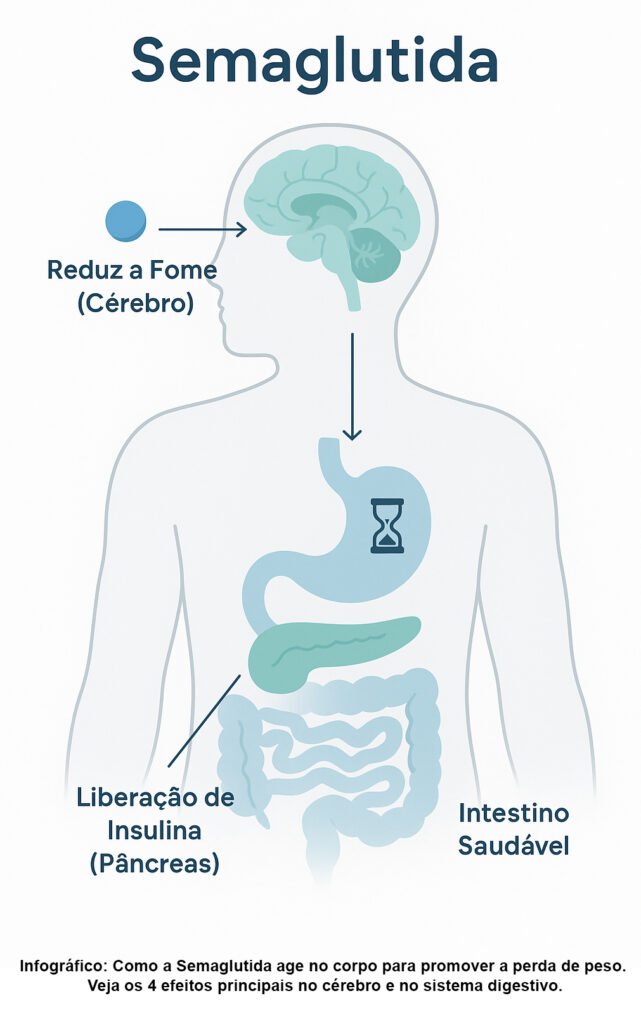 - Semaglutida: É o princípio ativo, a molécula farmacológica. Ela é um agonista do receptor do GLP-1 (peptídeo 1 semelhante ao glucagon), um hormônio naturalmente produzido pelo nosso intestino.